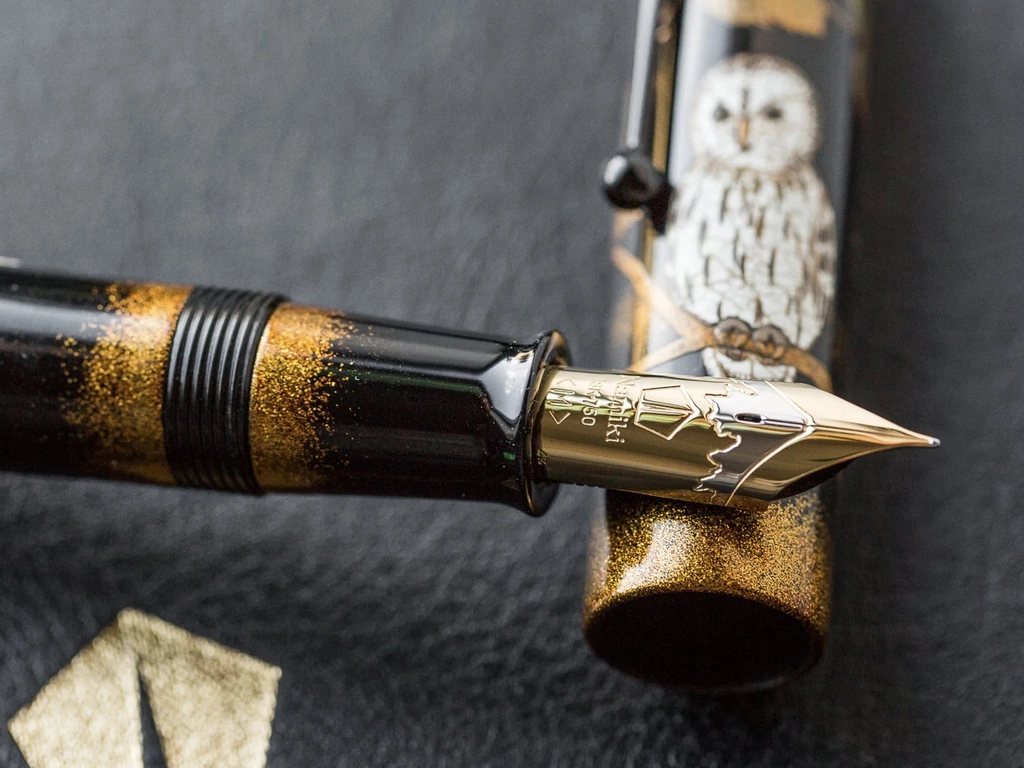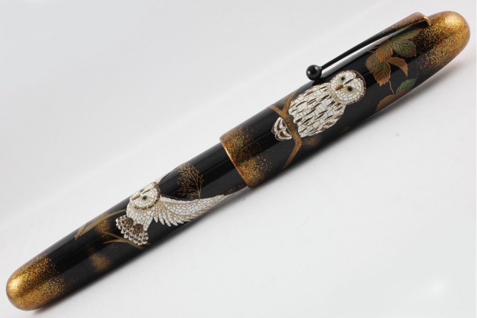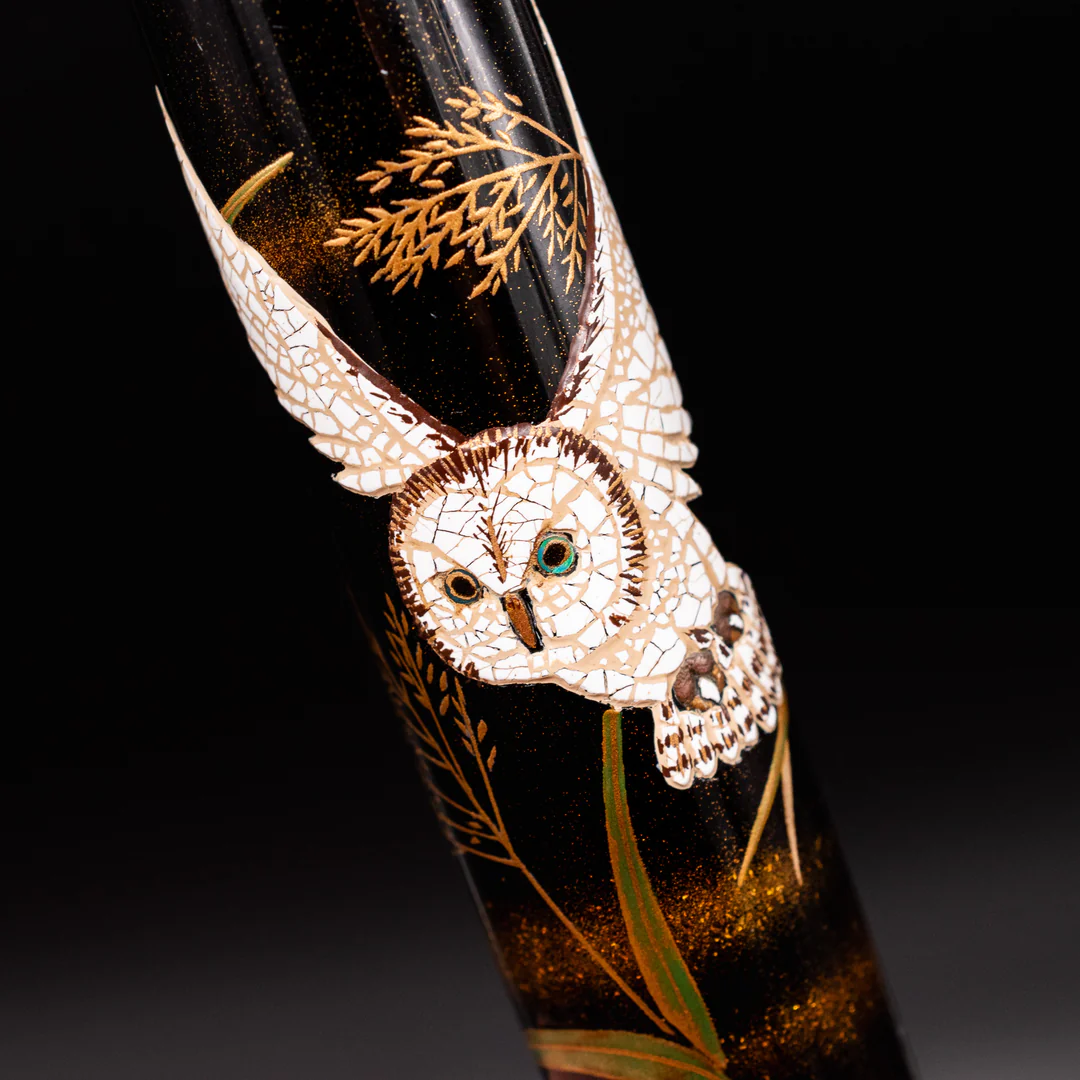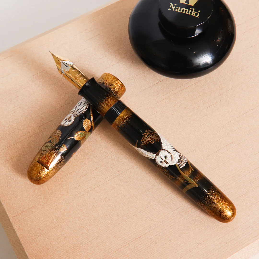 Thuộc dòng Emperor Size – kích thước danh giá và lớn nhất của Namiki – thân bút được chế tác từ ebonite nguyên khối, phủ nhiều lớp Urushi tự nhiên được hoàn thiện thủ công qua quy trình kéo dài nhiều tháng. Hình ảnh chim Cú được thể hiện tinh xảo, mang hàm ý phong thủy về sự bảo hộ, trí tuệ minh triết và thành công bền vững.
