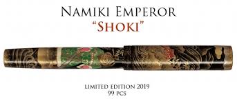 Phát hành giới hạn năm 2019 bởi Namiki, cây bút thuộc dòng Emperor Size – kích thước lớn nhất và danh giá nhất của Namiki. Thân bút được chế tác từ ebonite nguyên khối, phủ nhiều lớp Urushi tự nhiên và hoàn thiện bằng kỹ thuật Maki-e thủ công tinh xảo. Hình tượng Shōki – vị thần trừ tà trong văn hóa Á Đông – đại diện cho chính nghĩa, kỷ luật nội tâm và khả năng bảo hộ khỏi tà khí, thường được treo trong nhà như biểu tượng bảo vệ.